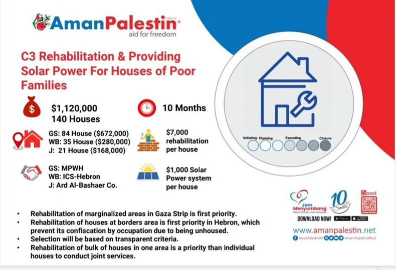 Projek Wakaf Baik Pulih Rumah Penduduk Miskin dan Tenaga Solar di Palestin merupakan inisiatif Aman Palestin bagi membantu saudara Islam kita di Palestin yang sehingga kini masih mengalami keperitan hidup akibat kezaliman Israel. Jadi ayuh sertai kami dalam usaha membantu saudara kita di sana dengan sumbangan anda dan sama-sama kita mengejar pahala 1000 bulan. Semoga kita semua direzekikan untuk mendapat Lailatul Qadar.